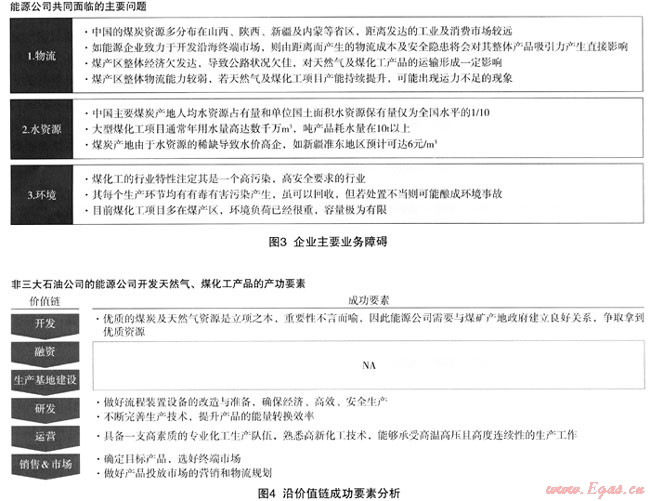 從目前情況來看,能源企業(yè)要開發(fā)非常規(guī)天然氣從事煤化工業(yè)務(wù)均需要消除以下障礙(圖3)。第一,物流:中國的煤炭資源多分布在山西、陜西,尤其是新疆及內(nèi)蒙等省區(qū),距離發(fā)達(dá)的工業(yè)及消費(fèi)市場較遠(yuǎn)。物流成本及運(yùn)輸安全隱患將會對企業(yè)運(yùn)營產(chǎn)生直接影響。與此同時(shí),煤產(chǎn)區(qū)整體經(jīng)濟(jì)欠發(fā)達(dá),公路狀況欠佳,對天然氣及煤化工產(chǎn)品便利的運(yùn)輸也造成能源公司共同面臨的主要問題一定影響;第二,水資源:中國主要煤炭產(chǎn)地人均水資源占有量和單位國土面積水資源保有量僅為全國平均水平的1/10,而大型煤化工項(xiàng)目通常年用水量高達(dá)數(shù)千萬m3,噸產(chǎn)品耗水量在1Ot左右,供求關(guān)系的嚴(yán)重失衡,造成煤炭產(chǎn)地水價(jià)高企,如新疆某煤化工園區(qū)的水價(jià)預(yù)測可達(dá)6元/m3,對項(xiàng)目經(jīng)濟(jì)陛產(chǎn)生較大影響;第三,環(huán)境:煤化工的行業(yè)是高污染,高安全要求的行業(yè)。每個(gè)生產(chǎn)環(huán)節(jié)均有有毒有害污染物產(chǎn)生,如若處置不當(dāng)就可能釀成環(huán)境事故。目前煤化工項(xiàng)目多在煤產(chǎn)區(qū),環(huán)境負(fù)荷已經(jīng)很重,環(huán)境容量有限,若一哄而上以產(chǎn)能、產(chǎn)量為目標(biāo),則可能對環(huán)境造成無法挽回的影響。