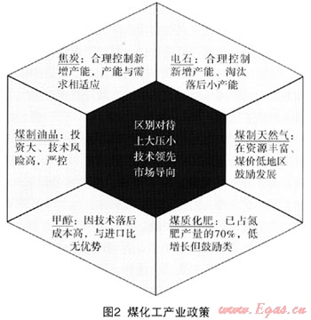 根據(jù)煤化工終端產(chǎn)品的不同,其重要性及配套政策也各不相同的。比如焦炭、電石及甲醇,因?yàn)樗鼈兌贾皇浅跫壍拿夯ぎa(chǎn)品,技術(shù)要求不高,產(chǎn)能已經(jīng)嚴(yán)重過剩,因此,合理控制新增產(chǎn)能,淘汰落后工藝就顯得尤為重要;而對于煤制氣,國家就采用了鼓勵政策,要求在資源豐富、煤價(jià)低的地區(qū)鼓勵發(fā)展;對于煤制油,因?yàn)槠渫顿Y需求巨大,技術(shù)風(fēng)險(xiǎn)相對較高,國家采取了嚴(yán)格監(jiān)管摸索前進(jìn)的方針(圖2)。