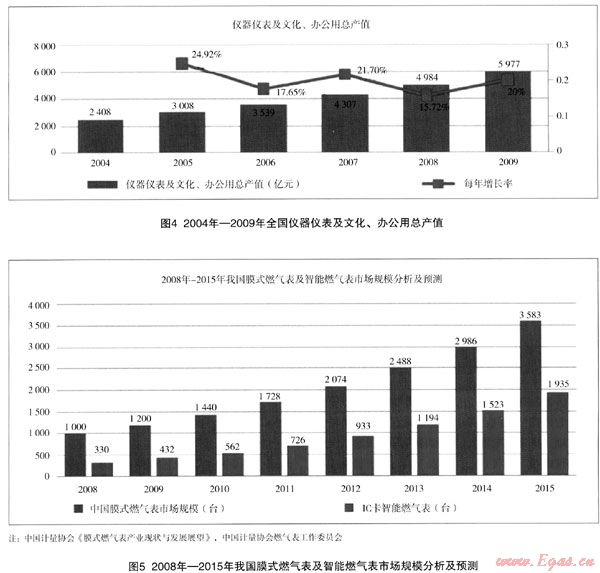 近幾年,我國儀器儀表及文化、辦公用行業(yè)發(fā)展迅速,2009年我國儀器儀表及文化、辦公用總產(chǎn)值達到5977億元。根據(jù)第5次全國人口普查數(shù)據(jù),我國共有家庭3.48億戶,城鎮(zhèn)人口約占總?cè)丝诘?5.68%,因此推算我國城鎮(zhèn)家庭約有1.58億戶。靜態(tài)地估計,國內(nèi)民用燃氣表的市場容量約為1.5億臺,目前我國處于傳統(tǒng)燃氣表向智能燃氣表的轉(zhuǎn)換階段,IC卡燃氣表、無線燃氣表和GPRS遠程燃氣監(jiān)控抄表系統(tǒng)將成為主要產(chǎn)品。根據(jù)國家計量檢定規(guī)程~JJG577—2005《膜式燃氣表》規(guī)定:以天然氣為介質(zhì)的燃氣表使用期限一般不超過10年,以人工燃氣、液化石油氣等為介質(zhì)的燃氣表使用期限一般不超過6年。因此燃氣表行業(yè)是一個持續(xù)發(fā)展的行業(yè),未來的市場前景廣闊。保守的估計,2008年以后國內(nèi)每年更新或新安裝的燃氣表1000萬臺以上,其中智能燃氣表占到30%以上。預(yù)計2010年以后國內(nèi)市場對燃氣表的年需求量可達1500萬臺以上,其中智能燃氣表將占總需求的40%左右,而且需求量呈逐年上升的趨勢,每年的增長率可達30%~35%。到2015年中國燃氣表的總需求量可達到3500萬臺~3700萬臺左右,其中智能燃氣表約占總需求量的50%~55%左右。本公司產(chǎn)品自1998年投放市場以來,大量的在線產(chǎn)品已經(jīng)進入更換期,因此在未來智能燃氣表更換市場中將釋放出巨大的市場潛力。