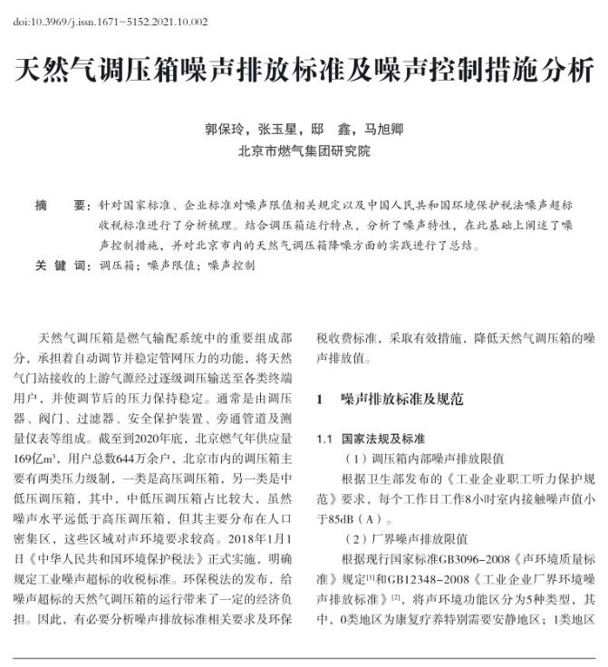 針對(duì)國家標(biāo)準(zhǔn)、企業(yè)標(biāo)準(zhǔn)對(duì)噪聲限值相關(guān)規(guī)定以及中國人民共和國環(huán)境保護(hù)稅法噪聲超標(biāo)收稅標(biāo)準(zhǔn)進(jìn)行了分析梳理。結(jié)合調(diào)壓箱運(yùn)行特點(diǎn),分析了噪聲特性,在此基礎(chǔ)上闡述了噪聲控制措施,并對(duì)北京市內(nèi)的天然氣調(diào)壓箱降噪方面的實(shí)踐進(jìn)行了總結(jié)。