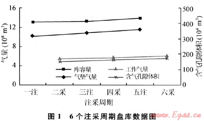 2) 所建立的盤庫系列數(shù)學(xué)模型除考慮庫內(nèi)混合流體性質(zhì)改變的影響外,還有一顯著特點(diǎn)是以注氣過程分析含氣孔隙體積和庫容量變化,同時注氣過程求得的含氣孔隙體積作為下一采氣過程分析氣墊氣量和工作量的主要依據(jù),依次交替計(jì)算從而使盤庫系列數(shù)據(jù)規(guī)律性和可靠性大大增強(qiáng)。