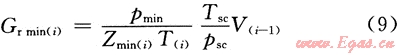 采氣末氣墊氣量計(jì)算模型的建立是以上一注氣周期末孔隙體積[V(i-1)]變化為依據(jù)(式7),再利用氣體狀態(tài)方程進(jìn)一步計(jì)算本采氣周期末對應(yīng)下限壓力時的氣墊氣量[Gr min(i)]。數(shù)學(xué)表達(dá)式為:
