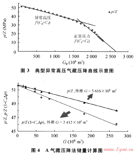 對異常高壓氣藏,由于儲層的欠壓實作用,使得巖石有效壓縮系數(shù)(Cf)比常壓氣藏高一個數(shù)量級,在4×10-6×10-3MPa-1,而表征氣體彈性膨脹能力的壓縮系數(shù)Cg值遠(yuǎn)低于常壓情況,其數(shù)量級也在10-3MPa-1,也就是說在高壓階段Cg值與Cf值數(shù)量級相當(dāng),因此在高壓階段不能忽略巖石孔隙壓縮所提供的彈性膨脹能量,這一特點使得高壓氣藏的壓降曲線出現(xiàn)兩段式(見圖3),直接用高壓階段的壓降曲線計算動態(tài)儲量會導(dǎo)致結(jié)果偏高。針對這一情況,異常高壓氣藏物質(zhì)平衡法考慮到了巖石有效壓縮系數(shù)Cf影響,對壓降曲線進(jìn)行了修正。圖4就是A氣藏壓降曲線圖,根據(jù)壓降曲線回歸,傳統(tǒng)的p/Z-Gp曲線計算動態(tài)儲量為3616×108m3,是容積法儲量的1.3倍,考慮到巖石有效壓縮系數(shù)的情況下,經(jīng)過修正后的壓降曲線計算動態(tài)儲量為2412×108m3,與容積法儲量基本符合。由此可見對異常高壓氣藏,巖石彈性膨脹為氣體的采出提供了不可忽視的能量。