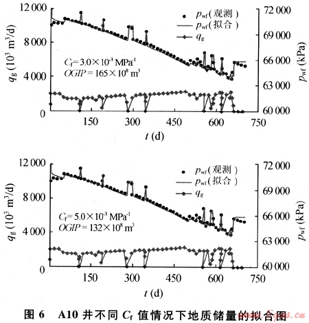 在數(shù)值模擬中,巖石壓縮系數(shù)作為已知參數(shù)輸入到模型中,其取值會給歷史擬合過程中儲量的擬合帶來影響,在其他參數(shù)相向、流壓和關(guān)井壓力完全擬合的情況下,不同的Cf值對應(yīng)不同擬合儲量(見圖6),從另一個角度來看,對于一個未投入開發(fā)異常高壓氣藏,以容積法儲量為基礎(chǔ)進(jìn)行生產(chǎn)動態(tài)預(yù)測時,不同的Cf值會得到不同的早期壓力變化趨勢。由此可見,對于異常高壓氣藏,獲得可靠的巖石壓縮系數(shù)值對早期動態(tài)儲量計算和生產(chǎn)特征認(rèn)識非常重要。