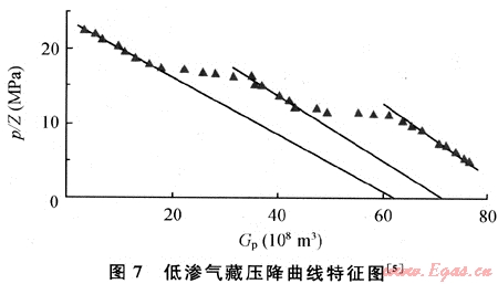 對于非均質(zhì)性比較強(qiáng)的低滲氣藏,儲層中的流動存在著啟動壓力。在開采初期,參與流動的主要是滲透率相對較高的或縫洞比較發(fā)育的儲層中的氣體,隨著天然氣的采出,儲層中的壓降漏斗進(jìn)一步增大,低滲儲層中的天然氣也開始參與流動。這類氣藏的壓降曲線(p/Z-Gp曲線)具有多段特征[7~8](見圖7)。如果利用早期的壓降曲線,會導(dǎo)致動態(tài)儲量計算結(jié)果偏低。