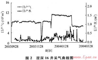 青海氣區(qū)的澀北一號氣田,從2000年以來屬于建產(chǎn)上產(chǎn)階段,但調(diào)峰氣量卻逐年加大。由于調(diào)峰對氣、水產(chǎn)量的影響也很明顯。統(tǒng)計(jì)2003年冬季該氣田主要參與調(diào)峰提產(chǎn)的13口氣井,提產(chǎn)前日產(chǎn)氣量87.4×104m3,日產(chǎn)水3.9m3,調(diào)峰期(61d)日產(chǎn)氣108×104m3,日產(chǎn)水9m3,調(diào)峰結(jié)束恢復(fù)原工作制度后,日產(chǎn)氣82.5×104m3,日產(chǎn)水8.7m3。很明顯氣量減少,而水量增加。如澀深16井調(diào)峰前后的氣、水產(chǎn)量曲線(圖2),調(diào)峰結(jié)束后氣量達(dá)不到調(diào)峰前的水平,而產(chǎn)水量卻明顯上升。