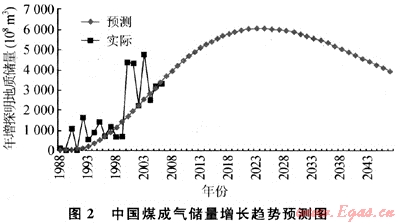 煤成氣儲量增長預(yù)測參數(shù)選?。篈=4500,C=12,x=3,T0=1988。