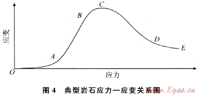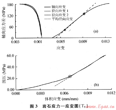 圖3是采用三軸巖石力學(xué)測試系統(tǒng)得到的巖石應(yīng)力-應(yīng)變關(guān)系曲線。從圖3-a可以看出:在應(yīng)力增大的初始階段,巖石發(fā)生的變形較大,有一定軟塑性變形,隨著軸向應(yīng)力增大(超過30MPa),逐漸過渡到穩(wěn)定的彈性變形階段,超過彈性極限后,巖石進入塑性變形階段,最終破壞失穩(wěn)。從圖3-b則可以更明顯地看出巖石在圍壓增大的初始階段變形較大,整個變形過程不是線彈性變形過程。
