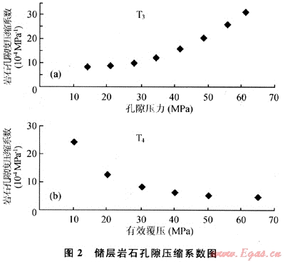 圖2是采用增加圍壓與降低孔隙壓力兩種方法所測得的巖石孔隙壓縮系數(shù)與應(yīng)力的關(guān)系曲線。從圖2中可以看出是變化值而非固定值,初始值很高,隨著圍壓增大、孔隙壓力減小,下降很快,圍壓、孔隙壓力達到一定值后,變化不大,保持穩(wěn)定,這表明在實驗過程中巖石發(fā)生的并非理想的線彈性變形。