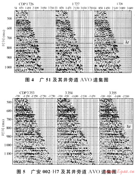 圖3是過(guò)廣51(工業(yè)氣井)和廣安002-H7(水井)的一條近道和遠(yuǎn)道疊加剖面對(duì)比圖,從圖中看出,須六段氣層底的反射在遠(yuǎn)道疊加剖面上的振幅明顯比近道疊加剖面振幅強(qiáng),近道疊加剖面主要表現(xiàn)為中-中弱振幅、較連續(xù),而遠(yuǎn)道振幅較強(qiáng),但橫向上振幅強(qiáng)弱變化明顯,有時(shí)呈低頻、復(fù)波特征;反射軸時(shí)常出現(xiàn)上下起伏、零亂等反射特征。水層在近道疊加剖面和遠(yuǎn)道疊加剖面上反射振幅都較強(qiáng),同相軸較光滑,呈高頻、連續(xù)特征,遠(yuǎn)道疊加剖面的反射振幅比近道略有增強(qiáng),但與氣層相比,不明顯。
