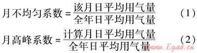 燃?xì)庥脩羧曛懈髟碌挠脷獠痪鶆蚯闆r用月不均勻系數(shù)來(lái)表示,逐月日平均用氣量出現(xiàn)最大值的月份稱為計(jì)算月,月不均勻系數(shù)最大值稱為月高峰系數(shù)。月不均勻系數(shù)和月高峰系數(shù)的計(jì)算公式為: