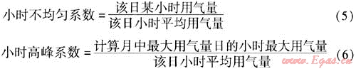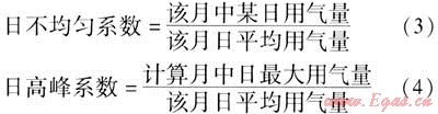日不均勻系數(shù)表示1個(gè)月中日用氣量的變化情況,最大日不均勻系數(shù)稱為日高峰系數(shù)。日不均勻系數(shù)和日高峰系數(shù)的計(jì)算公式為: