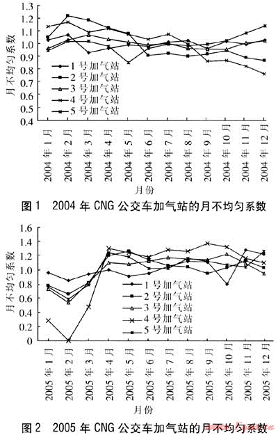 根據(jù)采集到的5座CNG公交車(chē)加氣站的加氣量數(shù)據(jù),按式(1)計(jì)算得到各站2004年、2005年的月不均勻系數(shù),見(jiàn)圖1、2。