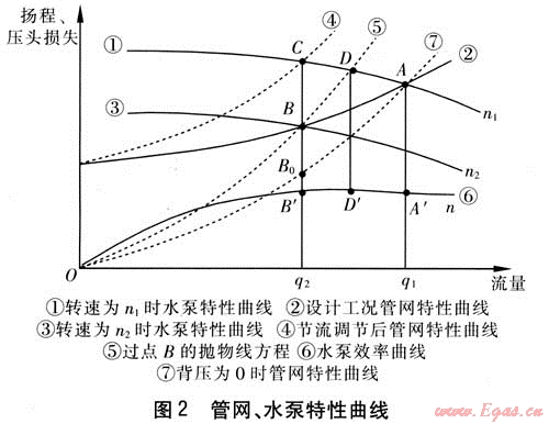 假設(shè)水泵的設(shè)計(jì)工況點(diǎn)為點(diǎn)4,對應(yīng)轉(zhuǎn)速n1、流量q1、揚(yáng)程hA、功率PA、效率ηA?,F(xiàn)需把流量調(diào)到q2,采用以下兩種方法:采用節(jié)流調(diào)節(jié),水泵的工況點(diǎn)變?yōu)辄c(diǎn)C,對應(yīng)轉(zhuǎn)速n1、流量q2、揚(yáng)程hC、功率PC、效率ηC;采用變頻調(diào)節(jié),水泵的工況點(diǎn)變?yōu)辄c(diǎn)B,對應(yīng)轉(zhuǎn)速n2、流量q2、揚(yáng)程hB、功率PB、效率ηB。管網(wǎng)、水泵特性曲線見圖2,下面分析變頻調(diào)節(jié)工況參數(shù)隨背壓的變化。