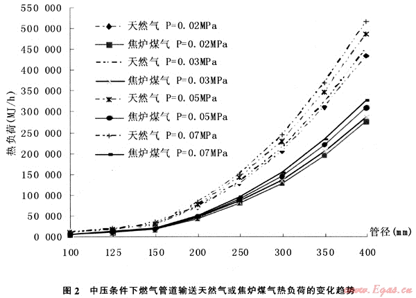 燃氣管道進口壓力分別為0.02MPa、0.03MPa、0.05MPa和0.07MPa時,在等壓降、等管徑以及相同管道長度的條件下,燃氣管道輸送天然氣與焦爐煤氣的熱負荷見表5。變化趨勢見圖2。由表5可知,對于兩者而言,在相同條件下,燃氣管道輸送天然氣相對焦爐煤氣熱負荷的增長率為57%~58%,即原有燃氣管道由焦爐煤氣置換為天然氣后管道輸送能力增長率為57%~58%。由圖2可知。分別對于燃氣管道輸送天然氣或焦爐煤氣而言。管道入口壓力不變管徑增大時熱負荷均明顯增大,增長曲線較陡;管徑不變管道入口壓力升高時燃氣輸送熱負荷也增大,但增長較少。由此可見,管徑增大相比管道入口壓力升高更能影響燃氣輸送負荷的增長。
