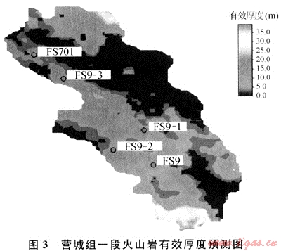 3) 屬性模型。研究區(qū)屬性建模采用測井曲線生成法,利用井筒巖石密度曲線數(shù)據(jù)建立密度模型[4]。由于火山巖與圍巖的區(qū)分十分復(fù)雜,單一屬性不能很好描述儲層分布[5],所以采用巖石密度和伽馬曲線這兩種對火山巖儲層較敏感參數(shù)進行建模,所以本區(qū)建立了密度和伽馬模型,并根據(jù)有效厚度劃分標準,預(yù)測了營城組一段有效厚度分布。本次建模過程中將密度曲線粗化后,進行變差函數(shù)分析,正確的變異函數(shù)估計要求對采樣方式、均值變化或樣品承載大小以及變異函數(shù)對方位變化的敏感性作出全面的評價。然后用密度反演體作為協(xié)變量,進行10次隨機實現(xiàn)[6~7]。圖2為通過昌德氣田的密度屬性模型得出的營一段儲層厚度預(yù)測圖,F(xiàn)S9區(qū)塊發(fā)育一個經(jīng)過FS701、FS9-1、FS9井的北西向火山巖條帶。
