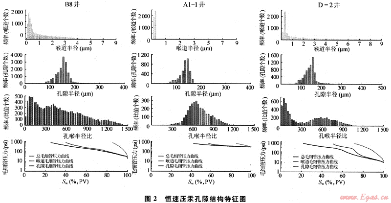 多數(shù)樣品孔隙半徑小于0.1μm,為微孔喉,占54.04%,大于0.5μm的為大孔喉僅為7.52%,0.1~0.5μm之間的為中小孔喉占38.44%,表明該區(qū)儲層孔隙半徑以微孔喉為主,孔隙結(jié)構(gòu)有5種形式,儲層主要為Ⅰ、Ⅱ、Ⅲ類;火山巖儲層巖心排驅(qū)壓力平均為7.63MPa,其中排驅(qū)壓力較小聲d<1MPa的樣品占17.55%,pd在1~5MPa的樣品占47.35%,最大汞飽和度平均為68.14%,剩余汞飽和度平均49.34%,退出效率為36.22%,反映研究區(qū)連通性好的樣品比例較低,孔喉比較大,連通孔隙的平均孔喉少,孔隙大小的均一程度較差,表明巖心中孔隙與喉道的尺寸大小不均勻(圖1)[4]。