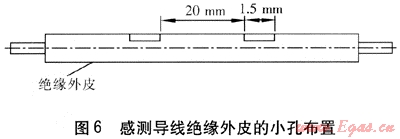感測導線的絕緣外皮有規(guī)則的孔(見圖6),小孔可以感知保溫層濕度的變化??椎拈g隔為20mm,每個小孔的寬度為1.5mm。漏點檢測系統(tǒng)要求感測導線、反饋導線與管道之間的阻抗以及兩導線之間的絕緣電阻必須大于等于50MΩ。
