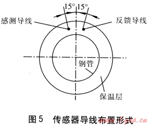 使用鎳鉻合金線作為傳感器導線,分為感測導線、反饋導線,兩根導線總稱為傳感器導線。供熱管道制造過程中,在每段管道中安裝兩根導線,傳感器導線布置形式見圖5。