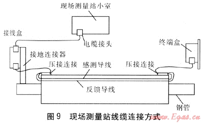 現(xiàn)場測量站線纜連接方式見圖9。主要連接裝置有:現(xiàn)場測量站小室內(nèi)安裝漏點檢測模塊、通信模塊等;現(xiàn)場測量站小室與接線盒之間的連接電纜;帶有接地連接器的接線盒;用于連接感測導線與反饋導線的終端盒等。現(xiàn)場測量小室、接線盒、終端盒、連接電纜的防護等級均為IP65。