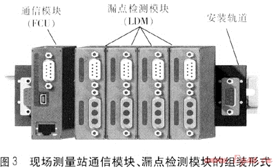 現(xiàn)場測量站通信模塊、漏點檢測模塊的組裝形式見圖3,所有模塊均安裝在軌道底板上,結構簡單,安裝方便。漏點檢測模塊的作用是:測量管道與傳感器導線之間的阻抗;通過傳感器導線與其他漏點檢測模塊通信(采用管段兩端測量時);支持不同管段通信模塊間的數(shù)據(jù)傳輸;當有泄漏發(fā)生時,發(fā)出報警信號。