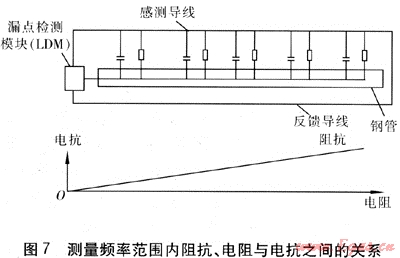 感測導線用于測量阻抗,且與反饋導線形成回路,因此感測導線與反饋導線必須在被測管段的末端連接在一起形成一個回路。這樣,漏點檢測系統(tǒng)通過檢測感測導線與反饋導線之間的電阻,以及感測導線與管道之間的阻抗判斷管道是否泄漏,依此監(jiān)測管道和保溫層之間的濕度,經(jīng)軟件處理確定泄漏度和漏點位置。