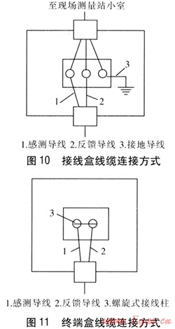 每一段檢測管段安裝一個接線盒,接線盒安裝在接地連接器上,接地導線與接地連接器連接,接地連接器焊接在管道上做到接地良好。接線盒經(jīng)連接電纜與現(xiàn)場測量站小室相連,接線盒線纜連接方式見圖10。在管段的末端安裝終端盒,將感測導線與反饋導線相連,終端盒線纜連接方式見圖11。