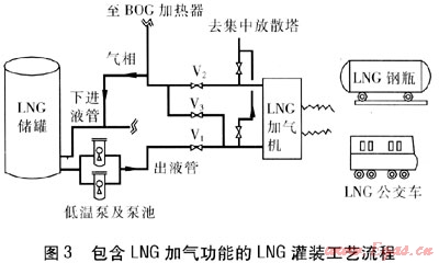 如果LNG氣化站周邊區(qū)域存在LNG汽車生產(chǎn)廠商(LNG汽車出廠發(fā)貨前需加注LNG)或者與公交公司達(dá)成LNG汽車推廣合作意向后,便可利用LNG氣化站的現(xiàn)有設(shè)施延伸增加LNG汽車加氣功能,即通過改進(jìn)原有LNG灌裝工藝,將LNG鋼瓶灌裝與LNG汽車加氣兩大流程組合集成,從而形成一套系統(tǒng)、兩種功能的LNG灌裝系統(tǒng)。