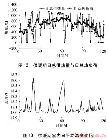由圖11~13可知,地板輻射供暖系統(tǒng)日平均供回水溫度為18~30℃,日平均供回水溫差為1~5℃。日總供熱量的變化趨勢基本與地板輻射供暖系統(tǒng)日平均進(jìn)出口溫度基本一致。整個供暖期,室溫均在18℃以上,滿足要求。