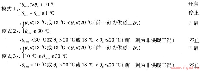 系統(tǒng)主要由平板型太陽能集熱器、地下坑槽內(nèi)的水平埋管換熱器、熱泵機組、地板輻射供暖系統(tǒng)等組成。系統(tǒng)在全年運行中,主要有以下4種運行模式: