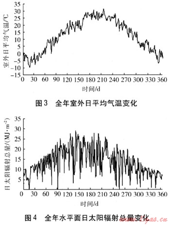 在模擬分析中,采用中國氣象局氣象信息中心提供的建筑熱環(huán)境氣象數(shù)據(jù)集中北京地區(qū)典型年的氣象數(shù)據(jù)[12]。全年室外日平均氣溫及水平面日太陽輻射總量見圖3、4。由圖3、4可知,在非供暖期,室外溫度較高,太陽輻射較強,可以把這部分太陽能儲存到地下坑槽中,供暖期再用熱泵提取,進(jìn)行供暖。在供暖期,太陽輻射與建筑熱負(fù)荷在時間上不同步,供暖初期和末期,太陽輻射較強,室外平均溫度較高,熱負(fù)荷較小;供暖中期,室外平均溫度較低,熱負(fù)荷較大,太陽輻射較弱。因此,在供暖初期和末期,優(yōu)先利用集熱器收集的太陽能供暖,減少熱泵的耗電量,提高系統(tǒng)的性能。