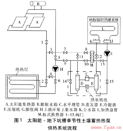 太陽能-地下坑槽季節(jié)性土壤蓄熱熱泵供熱系統(tǒng)流程見圖1。
