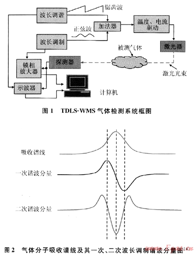 技術(shù),其系統(tǒng)框圖見圖1。圖1中采用加法器將高頻正弦調(diào)制信號同低頻調(diào)諧信號結(jié)合起來,作為激光器的驅(qū)動電流,在光電探測器將氣體吸收之后的光信號轉(zhuǎn)變?yōu)殡娦盘栞敵霾⒂面i相放大器進行相敏檢波,從而獲得被測氣體吸收譜線的諧波分量。圖2為氣體分子吸收譜線及其一次、二次波長調(diào)制諧波分量的示意圖。