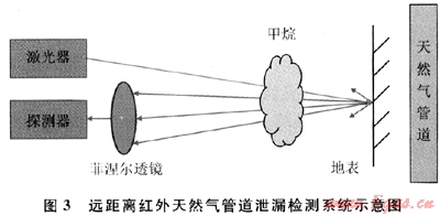 激光器輸出的1650nm的激光(甲烷氣體在1650nm附近存在強吸收譜線)經(jīng)過放大功率為1W的拉曼放大器放大后,照射在地表上,地表附近泄漏出的甲烷氣團對激光吸收后,剩余的激光照射在陸地表面,經(jīng)反射、散射之后的激光再次通過甲烷氣團,然后通過一個大的菲涅爾透鏡會聚到光電探測器上。該系統(tǒng)在100~150m的探測范圍內(nèi)可以獲得71.4mg/m3的探測靈敏度,系統(tǒng)信噪比大于3[5]。能夠?qū)崿F(xiàn)復(fù)雜環(huán)境下天然氣輸送管道泄漏的高靈敏度檢測。英國蘇格蘭天然氣管道系統(tǒng)采用上述方法進行天然氣泄漏檢測,但是此項技術(shù)目前在我國還沒有正式的應(yīng)用。