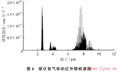 現(xiàn)有的硫化氫檢測多采用化學(xué)方法,需要將儀器放在硫化氫氣體中或者對環(huán)境中的氣體進行采樣來分析其濃度,既無法保證實時監(jiān)測,同時威脅到檢測人員的安全。而遠(yuǎn)距離紅外甲烷檢測技術(shù)同樣可以用在對硫化氫的遠(yuǎn)距離實時探測上。從HITRAN 2008[1]氣體分子紅外吸收光譜數(shù)據(jù)庫可以知道,硫化氫在2.6μm和7.7μm附近有較強的吸收帶,在4μm處有相對較弱的吸收譜(圖4)。在空氣中檢測隨天然氣泄漏的硫化氫氣體,首先要克服空氣中的水蒸氣和殘余的甲烷氣體的干擾。水蒸氣在2.6μm處存在強吸收譜,同時甲烷在7.65μm也存在比硫化氫吸收強度大幾十倍的吸收譜線。