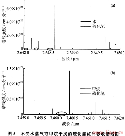 對泄漏在空氣中的硫化氫氣體進行遠(yuǎn)距離檢測,空氣中殘留的甲烷、水蒸氣的干擾不可忽略。紅外光譜是分子振動轉(zhuǎn)動的特征譜線,不同分子因為化學(xué)鍵的不同,具有不同波長的吸收譜。同時氣體分子的吸收光譜并不是連續(xù)分布的,而是在一個波長范圍里離散的存在。譜線的寬度受到壓力的影響而有不同程度的展寬,在不同的壓力下具有高斯、Voigt或者洛倫茲分布。氣體分子的吸收譜線之間可以因為相近而存在交疊,或者由于分布較遠(yuǎn)而留有空白區(qū)。因此,通過詳細(xì)分析水蒸氣、甲烷、硫化氫氣體在不同波長下吸收譜線之間的交疊情況,來選擇不受或者受水蒸氣、甲烷吸收譜線影響較小的硫化氫吸收譜線,并以此來進行檢測,從而確定出所要采用的光源波長、類型以及檢測方法等。圖5給出了根據(jù)HITRAN 2008分子光譜數(shù)據(jù)庫對硫化氫、水蒸氣和甲烷分子吸收譜線進行分析之后選定的硫化氫吸收譜線,圈中的譜線為硫化氫吸收譜線附近的弱吸收強度的水蒸氣或甲烷吸收譜線。從圖5可以看出,硫化氫在2.64μm(圖5-a)和7.46μm(圖5-b)附近能夠得到不受水蒸氣或甲烷明顯干擾的吸收譜線,用來實現(xiàn)紅外硫化氫檢測。