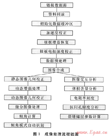 GeoReveal成像處理軟件在開發(fā)的過程中,針對國內(nèi)主流成像測井儀的設(shè)計原理、儀器結(jié)構(gòu)及測井方式,完成了成像資料預(yù)處理、圖像合成、圖像動態(tài)增強(qiáng)以及圖像繪制等一系列功能模塊。形成了一套功能強(qiáng)大、運(yùn)行穩(wěn)定的成像測井資料解釋處理系統(tǒng)。系統(tǒng)采用鏈?zhǔn)焦芾斫Y(jié)構(gòu)(圖1),提供給用戶方便、靈活的、交互性強(qiáng)的人機(jī)界面。