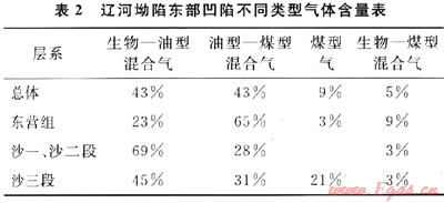 2) 在不同類型天然氣資源量比例上,總體上以生物油型混合氣和油型~煤型混合氣為主,各占43%,純煤型氣和生物 煤型混合氣含量較少,分別占總體的9%和5%;不同層系內(nèi)天然氣類型比例有較大的變化:東營(yíng)組以油型~煤型混合氣為主;沙一、沙二段以生物-油型混合氣為主體;沙三段各種類型天然氣都占一定比例。受沙三段上段煤層分布的影響,煤型氣的含量有所,上升達(dá)21%。