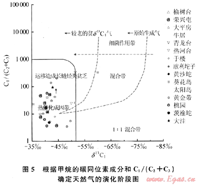 總體看,該區(qū)大部分天然氣含量有較大差異,說(shuō)明該區(qū)存在明顯的運(yùn)移作用過(guò)程。 依據(jù)天然氣甲烷碳同位素值及干燥系數(shù)對(duì)天然氣的成熟度進(jìn)行估算,該區(qū)絕大多數(shù)樣品處于成熟階段,主要屬于熱解氣。但在黃沙坨及葵花島地區(qū),其天然氣的成熟度相對(duì)比較高,已經(jīng)達(dá)到了裂解氣的階段。因而可依據(jù)天然氣的甲烷同位素值對(duì)各個(gè)地區(qū)天然氣的演化階段進(jìn)行劃分,主要屬于熱解氣。