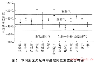 該區(qū)天然氣的碳同位素以-42‰占優(yōu)勢(shì),甲烷碳同位素分布的主要范圍為-35‰~-55‰。按不同的地區(qū)對(duì)甲烷同位素值進(jìn)行統(tǒng)計(jì),可知各個(gè)地區(qū)天然氣的甲烷碳同位素值主要處于熱解氣階段(圖2)。