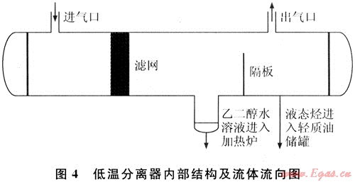 在低溫分離器中分離出來的液相經(jīng)過重力分離后,密度較小的液態(tài)烴從隔板頂部進(jìn)入儲(chǔ)油器,當(dāng)液位達(dá)到設(shè)定值,液位控制法就會(huì)自動(dòng)打開,使液態(tài)烴排出進(jìn)入儲(chǔ)油罐。低溫分離器內(nèi)部結(jié)構(gòu)見圖4[5]。