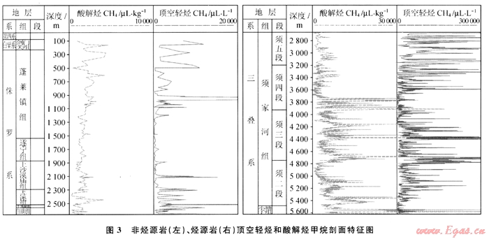 酸解烴所測(cè)的是歷史時(shí)期被礦物顆粒吸附和膠結(jié)物所捕獲的甲烷及其同系物,一般認(rèn)為其能夠反映歷史時(shí)期烴源巖的生烴特征和早期烴類大規(guī)模運(yùn)移特征,是歷史累積效應(yīng)的反映;而頂空輕烴所測(cè)是目前巖石礦物顆粒孔隙、裂縫中的甲烷及其同系物,反映的是現(xiàn)今地層含油氣特征及最近一期大規(guī)模運(yùn)移特征。
