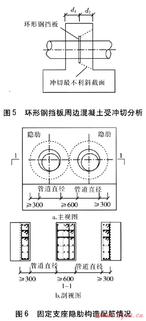② 管道穿過固定支座處,由于管道上環(huán)形鋼擋板對混凝土產(chǎn)生局部壓應(yīng)力,宜在孔邊加設(shè)隱肋[5],且隱肋內(nèi)的鋼筋總截面積不宜小于被切斷鋼筋截面積的1.5倍,并應(yīng)配置箍筋,見圖6,圖中數(shù)值單位為mm。