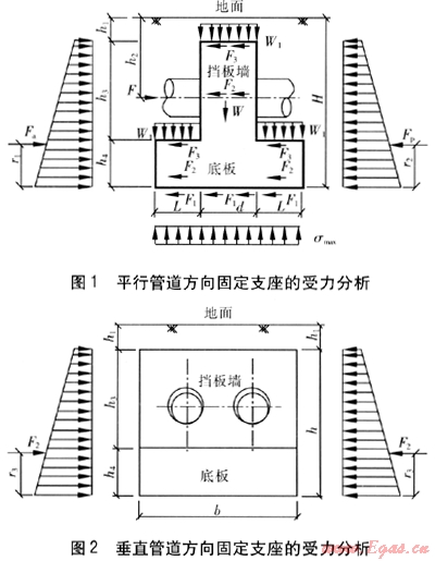 平行、垂直管道方向固定支座的受力分析見圖1、2。