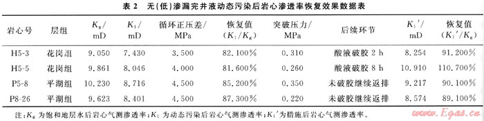 滲透率恢復值為120~130,但有沉淀、分層和絮凝,說明與地層水的配伍性良好。但是為考察無(低)滲漏完井液體系在高溫作用下的保護儲層效果即巖心滲透率恢復值情況,選取目標層4塊巖心進行完井液動態(tài)污染實驗,實驗溫度為120~130℃,動態(tài)循環(huán)正壓差為3.5~4.5MPa,實驗數(shù)據(jù)見表2。