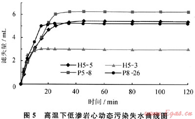 濾失性無(低)滲漏完井液體系在動態(tài)污染試驗的前20min,5塊巖心動態(tài)失水速率普遍較大,這可能是因為軟顆粒狀完井液受擠壓時發(fā)生的物理脫水現(xiàn)象,但總量均沒有超過7mL。20min左右,致密的碳化膠質(zhì)暫堵層逐漸形成,加上軟顆粒本身的物理暫堵功能,雙重暫堵下巖心基本不再發(fā)生濾失(圖5),說明無(低)滲漏完井液高溫下與巖心接觸時發(fā)生的化學質(zhì)變有利于控制完井液的失水滲漏。從濾失量減少為0的時間可看出,膠質(zhì)暫堵層在120~130℃下形成的時間在20min左右,最低的約6min,如H5-3號巖心,6min左右濾失量就降至為0,這可能與巖心中的黏土礦物類型和總含量有關(guān)。