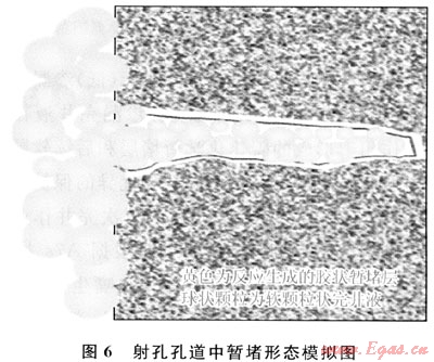 根據(jù)化學反應定律中溫度時間互為補償理論[11],在射孔期間巖石瞬間的高溫便可加速擠入炮眼中的有機高吸水材料的碳化(熱催化)反應,碳化暫堵層的形成時間將大為縮短,可有效降低完井液的漏失。雙重暫堵模型見圖6。