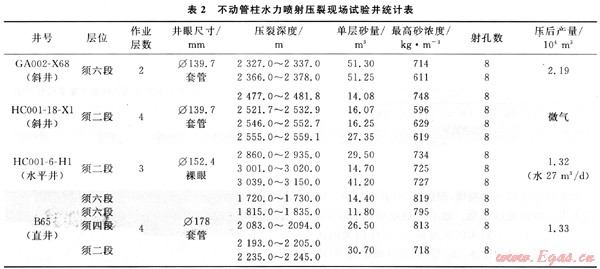在前期大量有效研究的基礎(chǔ)上,共完成了4口井的現(xiàn)場(chǎng)試驗(yàn)。試驗(yàn)結(jié)果表明:目前已經(jīng)形成了井深3000m以內(nèi)的不動(dòng)管柱水力噴射壓裂工藝及配套技術(shù);研制的井下工具工作壓力達(dá)到60MPa、工作溫度達(dá)到90℃,在Φ178、Φ139.7mm兩種套管和Φ215.9、Φ152.4mm兩種裸眼使用。試驗(yàn)井實(shí)現(xiàn)不動(dòng)管柱壓裂3~4條縫,單縫壓裂成功率100%。返排后,投產(chǎn)順利,其中HC001-6-H1井實(shí)現(xiàn)了3段合采,865井實(shí)現(xiàn)了3層(4段)合采(表2)。