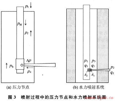 水力噴射逐層壓裂工藝不使用封隔器,就可以實(shí)現(xiàn)多層壓裂。其所依賴的機(jī)理就是在噴嘴出口處形成的負(fù)壓導(dǎo)引流體轉(zhuǎn)向,只進(jìn)入射孔孔道中而不會(huì)進(jìn)入到已經(jīng)壓開的層段。因此,環(huán)空壓力的控制是關(guān)鍵(圖3-b)。