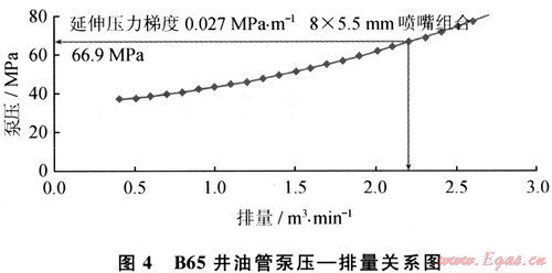 由于裂縫延伸壓力(pp)、管路摩阻(pf)、靜水柱壓力(pH)都是不難得到的參數(shù),因此,只要按照式(3)計(jì)算噴嘴壓降,就可以根據(jù)式(2)計(jì)算出施工時(shí)的地面泵壓。以B65井為例,得到油管泵壓 排量關(guān)系圖版(圖4)。